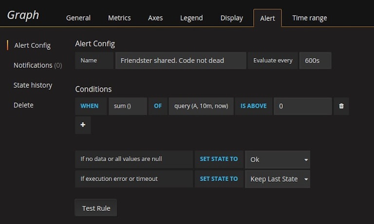 After you add a graph to your panel, you can easily configure an alert with notifications to Slack, email or whatever you prefer, so that you are pinged if this code is executed.
