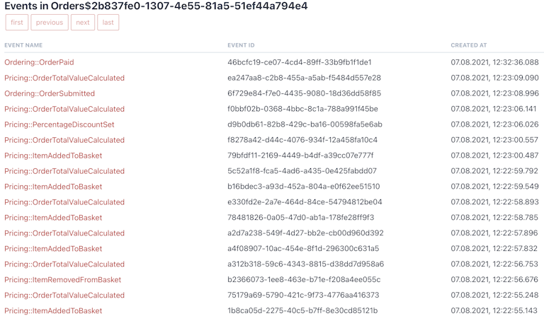 You see, previously all the events were published from the Ordering::Order aggregate, which means they were part of one stream. All we’ve had to do was just to link the “history” button with the RES Browser and point to the Ordering::Order stream.