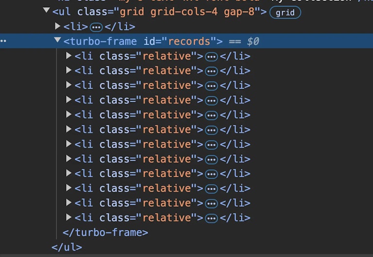 Turbo Frames are inserted into the DOM as a new element, which can break the layout. Frame is inserted into the second column of the grid, and so are all the records.